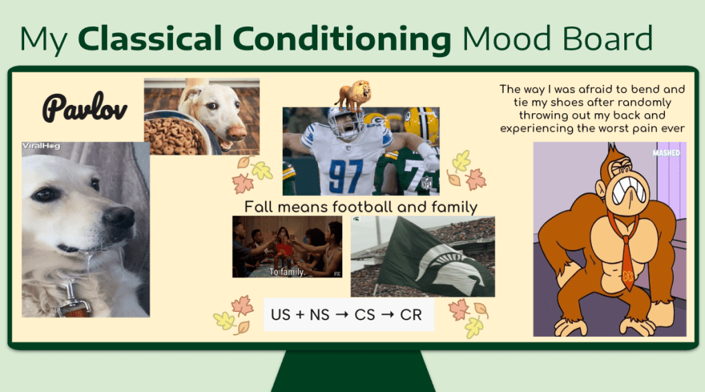 My mood board has a few images reflecting Pavlov’s work with dogs. It was fun to read more about him because I never realized his findings were not his original intention. I have added US + NS → CS → CR to show how CC works. I included a silly little GIF of DK hunched over, grabbing his back, because I was classically conditioned to be afraid of tying my shoes (CR). A few years ago, I was training for a run. I sat down to tie my shoes (as I ALWAYS had, also the NS), and when I stood up, I experienced the worst pain of my life (US). I was stuck lying on our tile floor for two days, made it to the chiropractor, and was walking hunched over for a few days after that. Now, I’ve added morning and evening stretching times to hopefully prevent that from ever happening again.